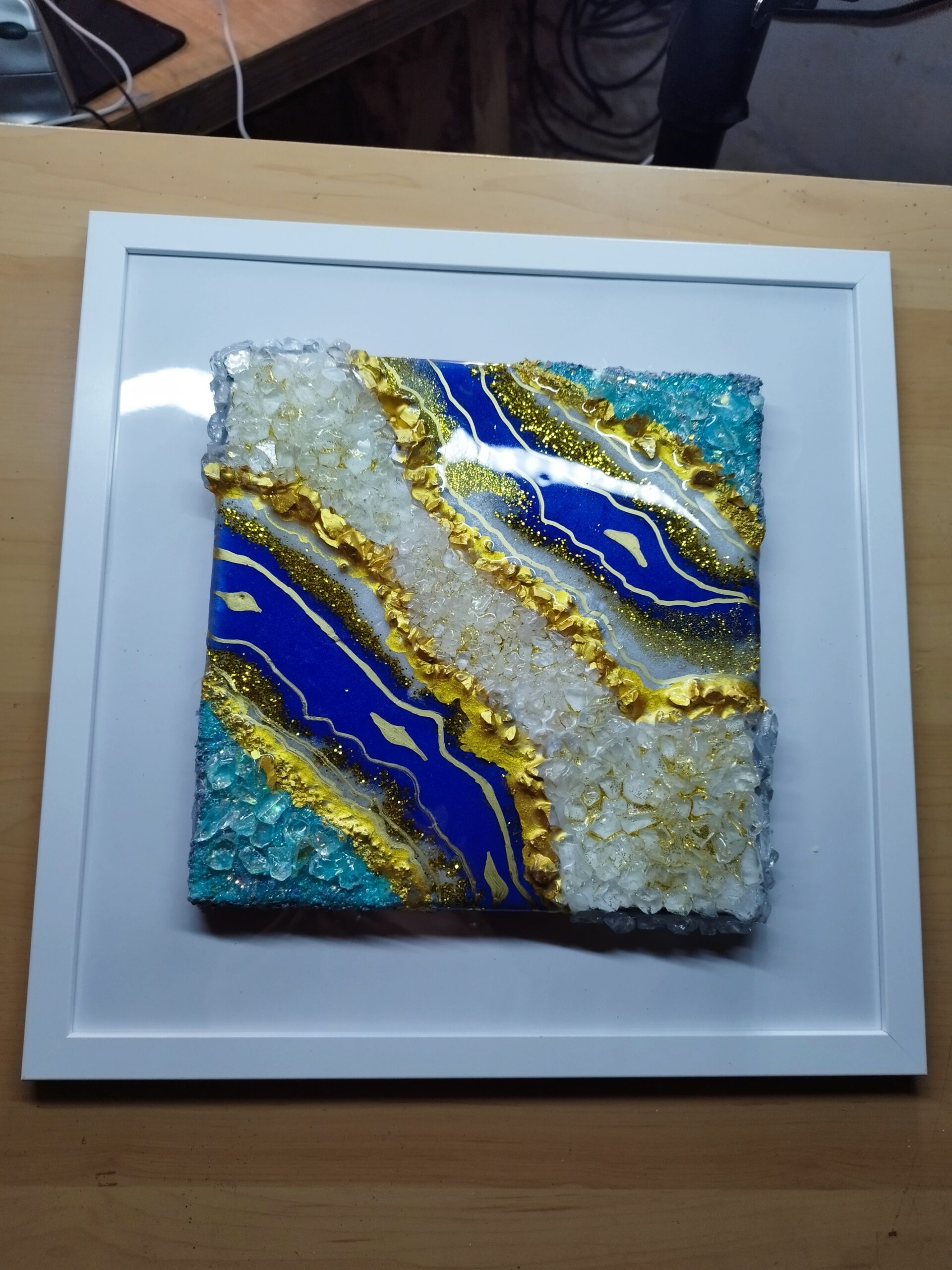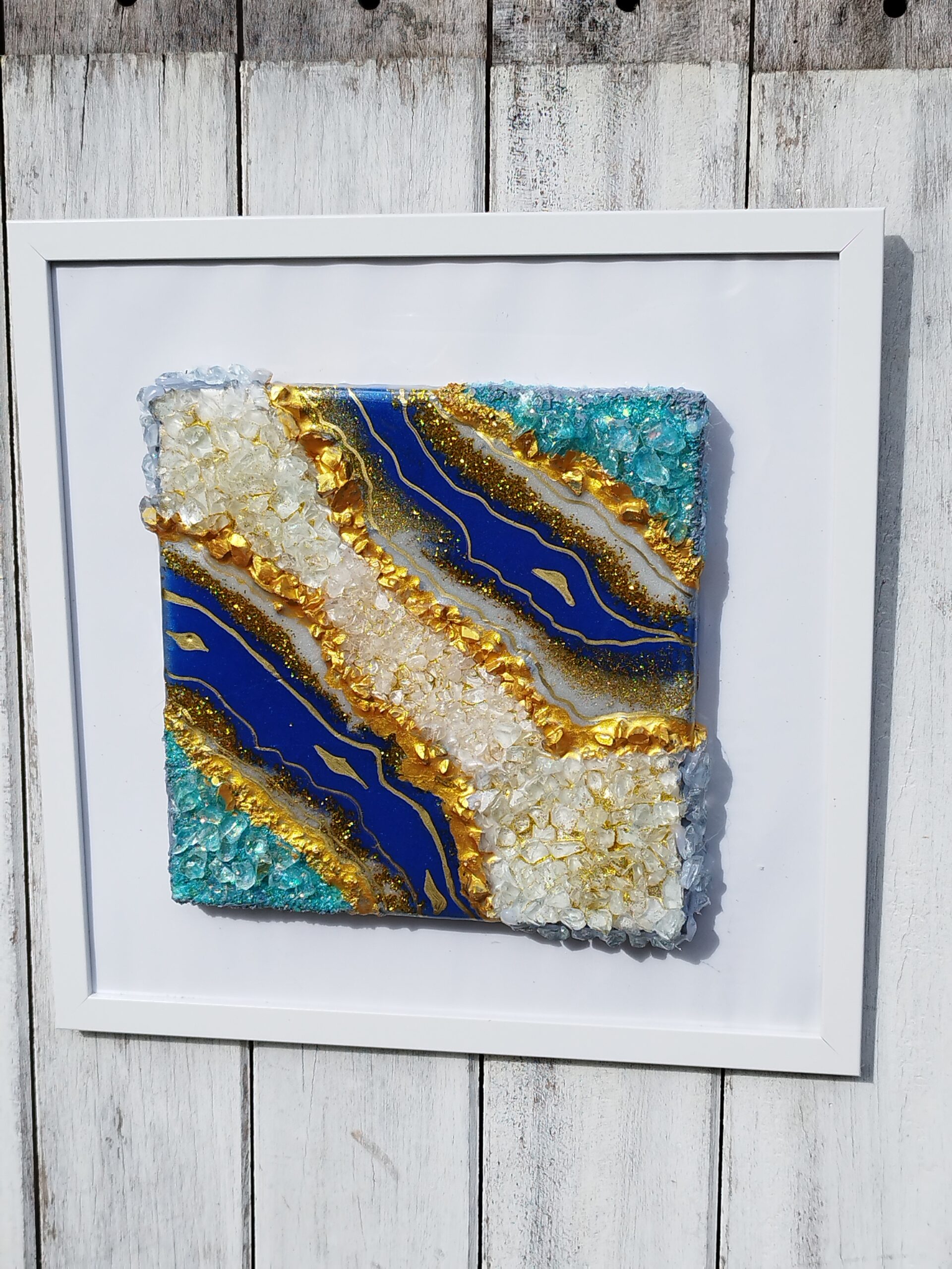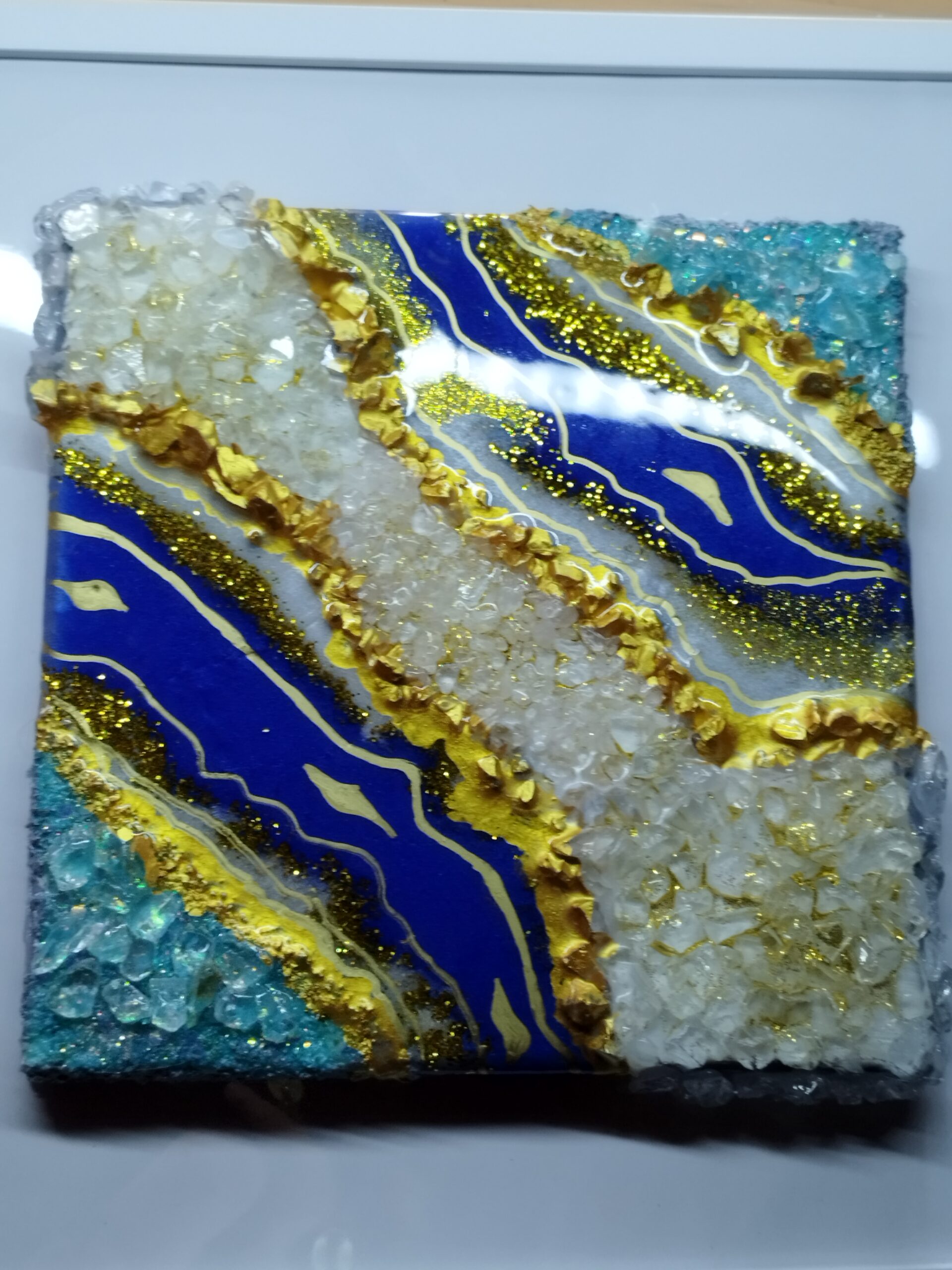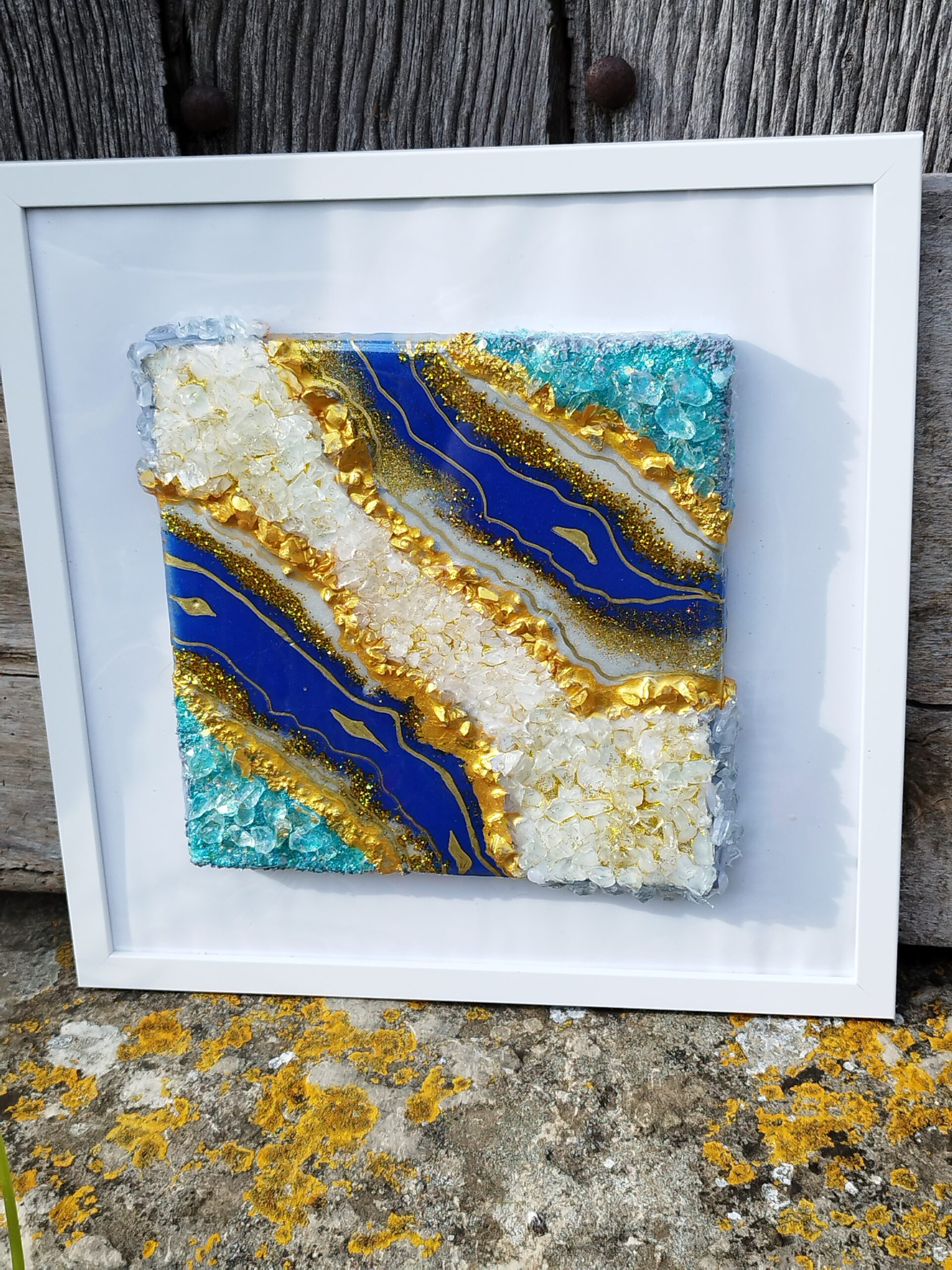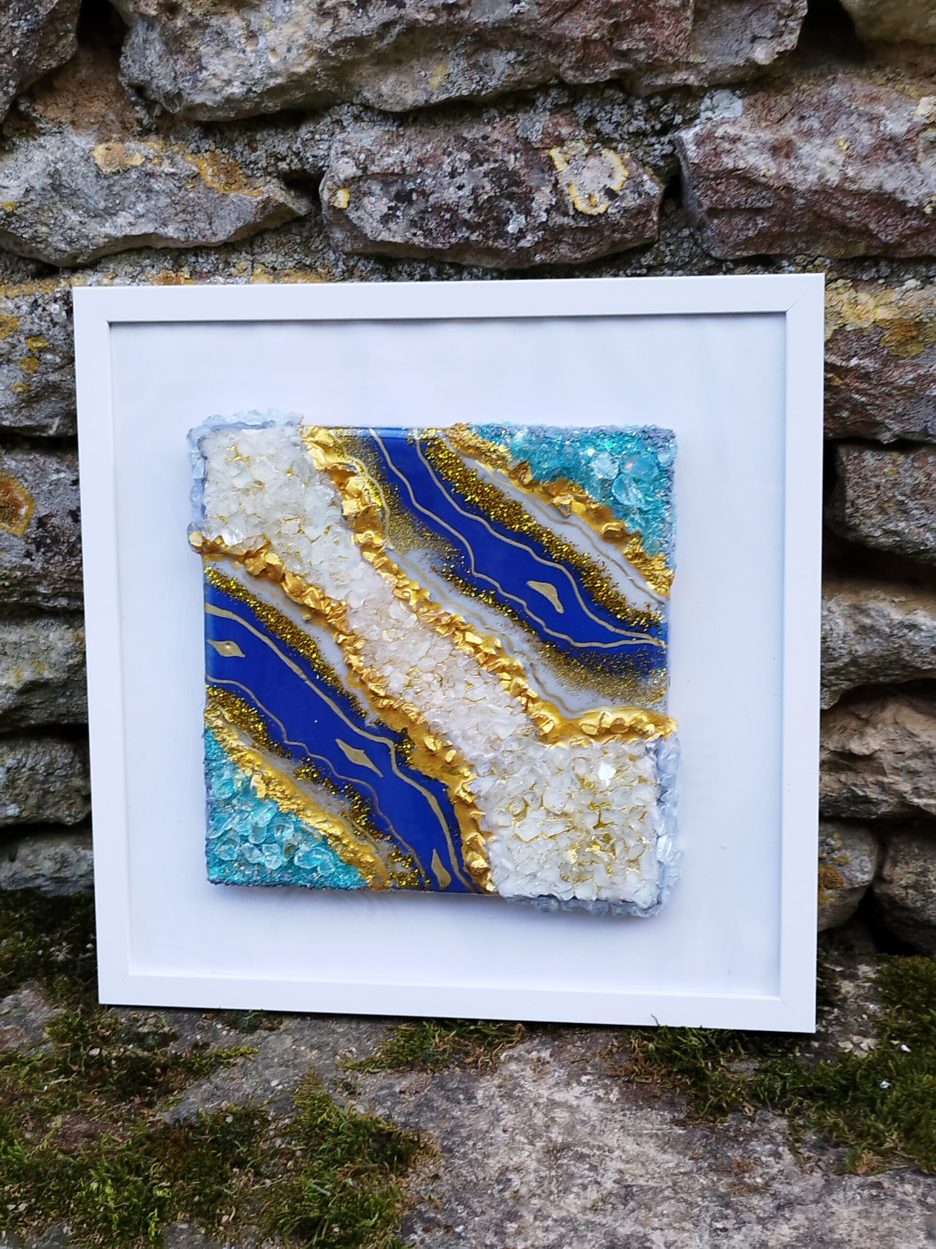 Introducing our breathtaking Géode resin art work, a stunning piece that seamlessly combines striking blues with luxurious gold hues. Perfectly sized at 30 cm by 30 cm, this artwork comes beautifully framed, ready to enhance your home or office decor. Whether you’re seeking a centerpiece for your living room, a focal point in your hallway, or an elegant addition to your office ambiance, this resin art piece delivers versatility and sophistication.