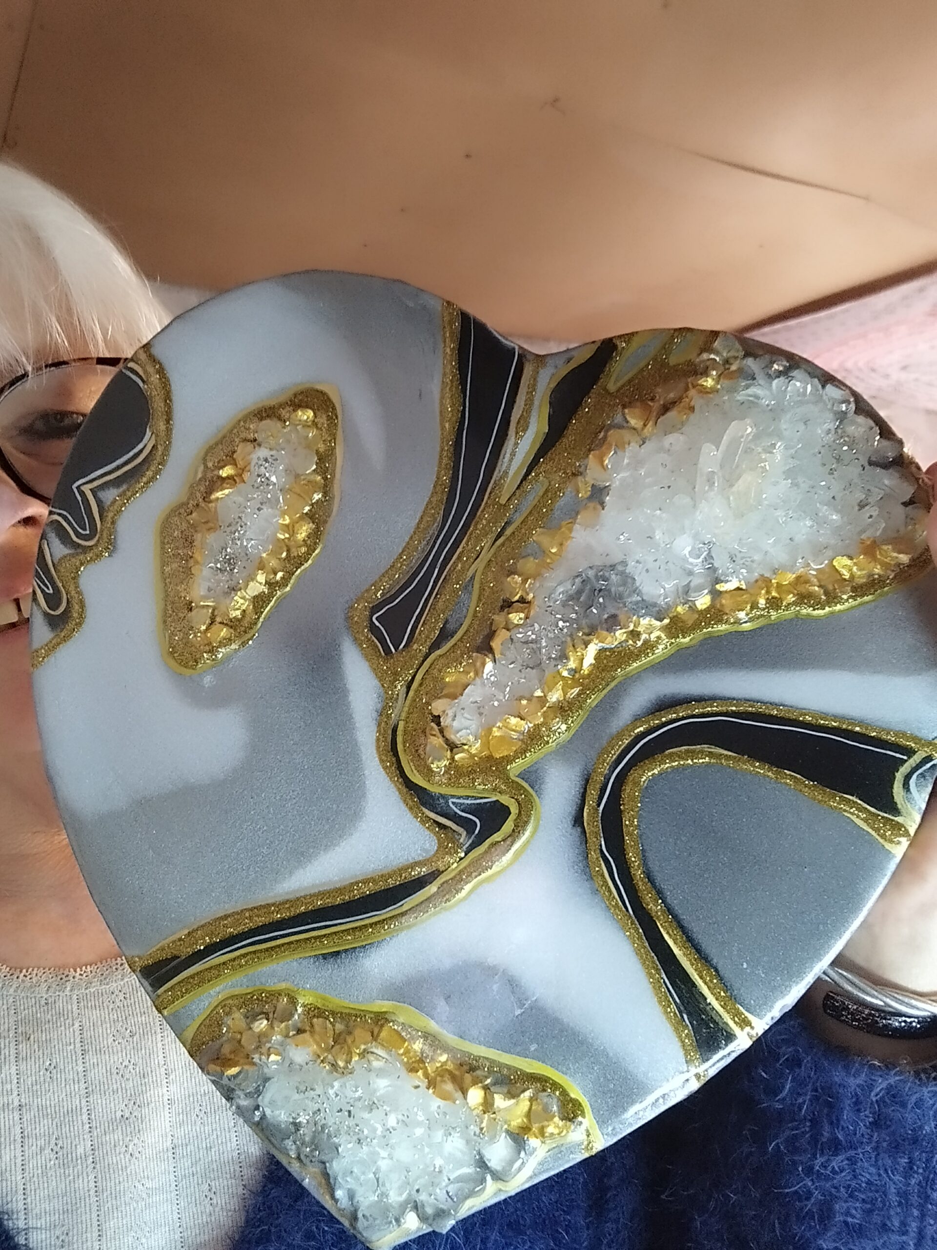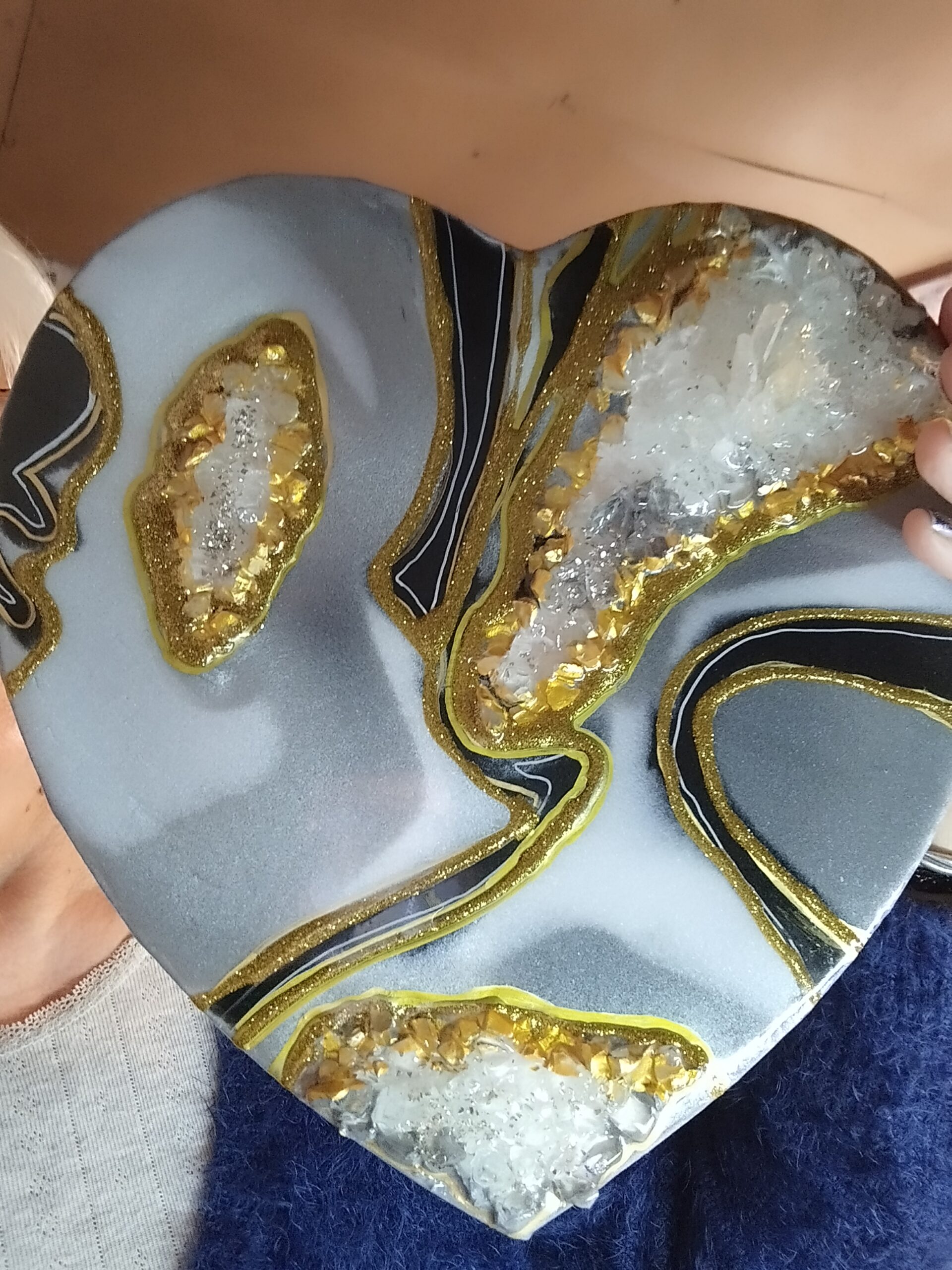 Introducing our Gorgeous Heart Shape Géode Art Work, a stunning addition to any home or office decor. This exquisite piece captures the natural beauty of géodes, skillfully crafted into a heart shape that symbolizes love and beauty. The captivating blend of gold, greys and blacks makes it a versatile choice, pairing beautifully with a variety of color schemes and styles.